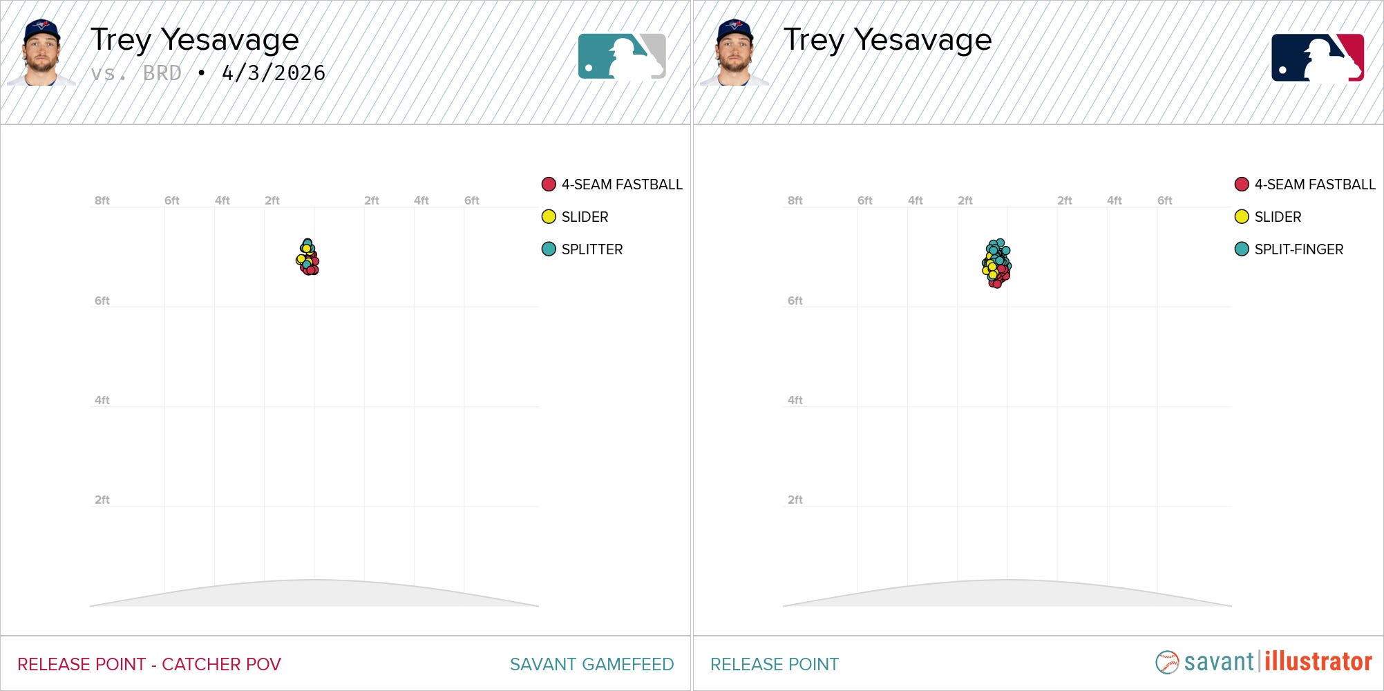 Maybe more importantly, given the nature of the injury he’s been dealing with, his release points looked pretty much exactly like you’d want. (Friday’s start on the left, 2025 in the big leagues on the right).